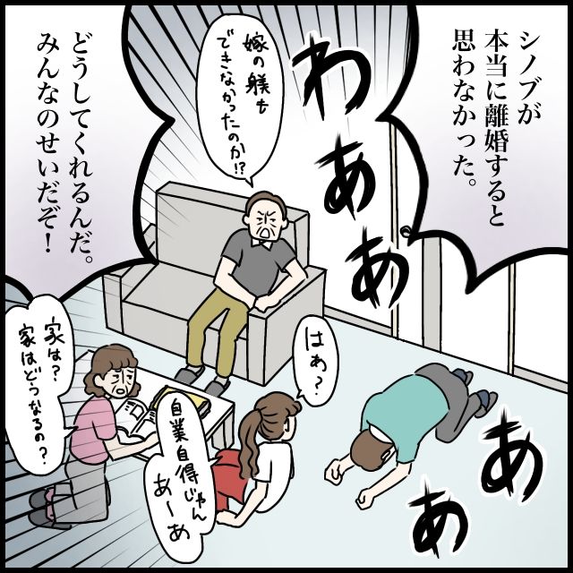 「シノブが本当に離婚すると思わなかった」そう言って「わぁああああ!!」と打ちひしがれるナオヤに、「嫁の躾もできなかったのか!?」と義父が言ったかと思うと、「家は?家はどうなるの?」とまだ言い続ける義母。そして「はぁ?自業自得じゃん。あーあ」と呆れる義姉に向かって、「どうしてくれるんだ。みんなのせいだぞ!」ナオヤが泣き叫ぶのでした。