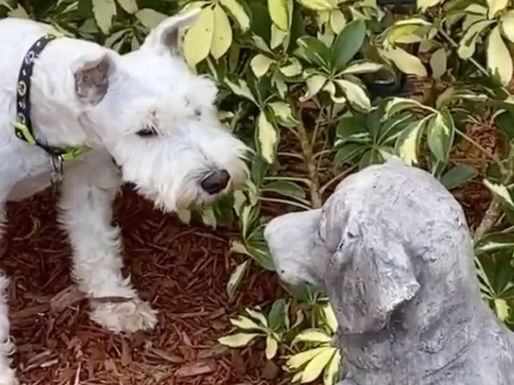 3. 「これ生きてる?」本物そっくりな彫像に警戒する犬さんの反応が面白い