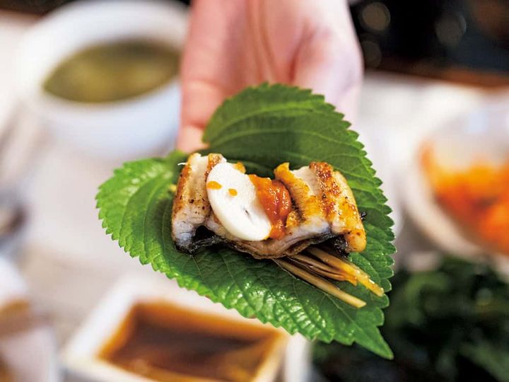 生のうなぎを目の前で焼いて食べるのが韓国式。日本のうなぎと一味も二味も違う! パリッパリのうなぎを一度は食べて。サンチュの上に、焼いたうなぎ、生のニンニク、生姜の千切りを一緒にのせて包んで食べるのが通の食べ方!