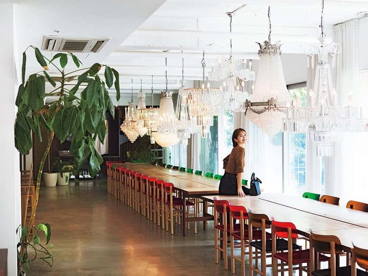 シャンデリアを使った空間づくりが心地よくつい長居してしまうカフェ。70年代に建てられた製薬会社の建物をリノベーションした複合文化施設。長く伸びたテーブルにジャスパー・モリソンの椅子、大きなシャンデリアが印象的。