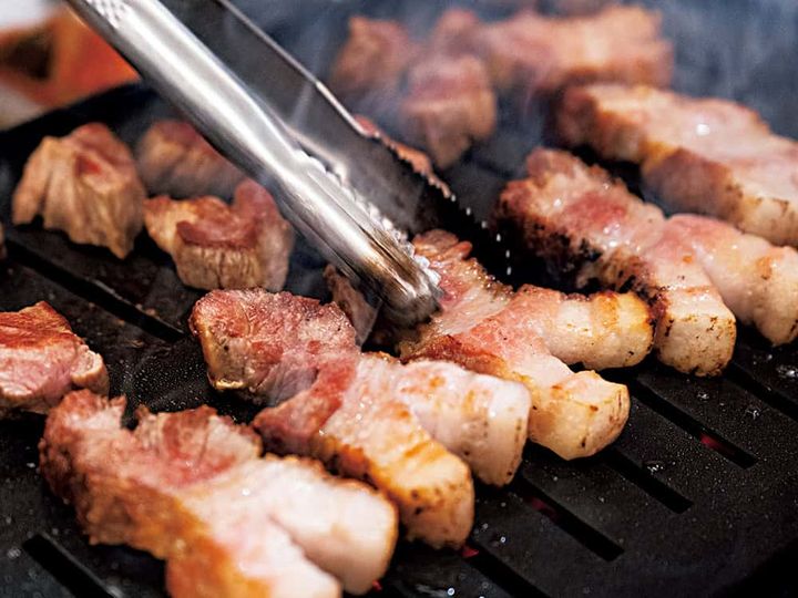 財閥の会長も食べに来た知る人ぞ知る人気焼肉店。焼くと脂身の部分が広がってウサギの耳みたいに見えるので「ウサギサムギョプサル」と呼ばれています。脂控えめで女性も嬉しい。