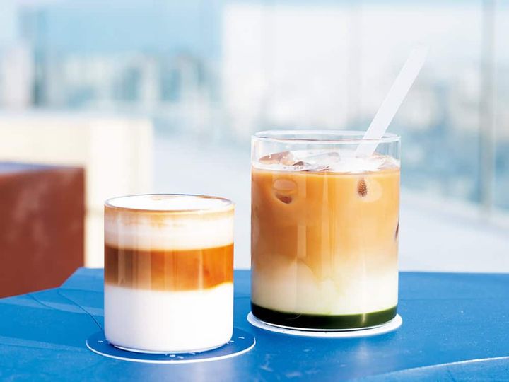 (右)抹茶ショットラテ W9,000(左)アイスフラットホワイト W7,500 カフェメニューの他にもビールやカクテルもあります。