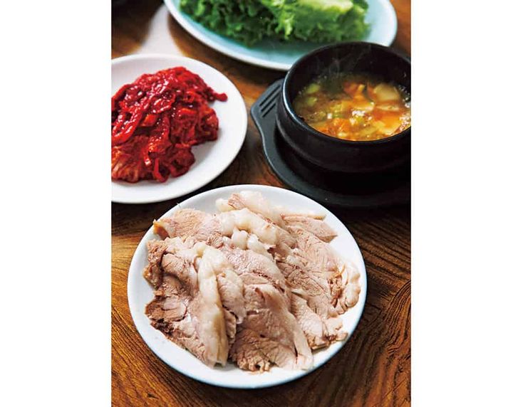 シルキーな茹で上がりが絶品。どこか懐かしい素朴な食堂もいい。秘伝の技を駆使して臭みを取ってから茹で上げた豚は普通のポッサムと違って薄切りになっているのが特徴的。おかずも優しい味。世界遺産の昌徳宮近く。