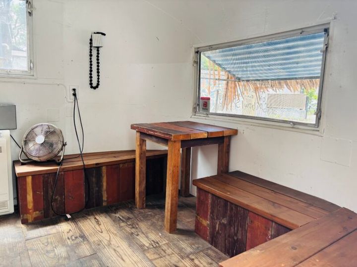 無骨な外観とは打って変わって、中にはかわいらしいイートインスペースが。まるでハワイの小さなカフェに来たかのような心地よさです。トレーラーの外にも、イートインスペースがあります。