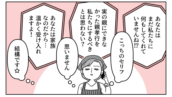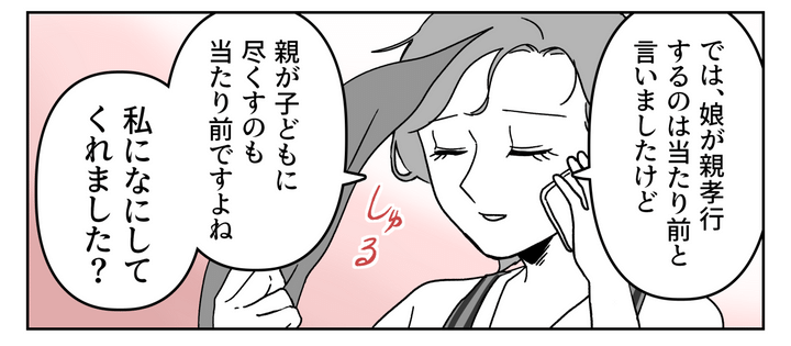でも、なにも助けてくれない人を助けようという気持ちはまったく湧いてこなかったのです。今まで一切になにもしてくれなかった人に、急に娘だの家族だの言われても……ねぇ?