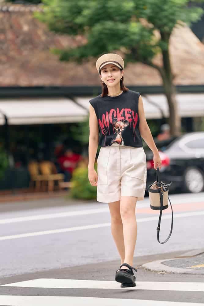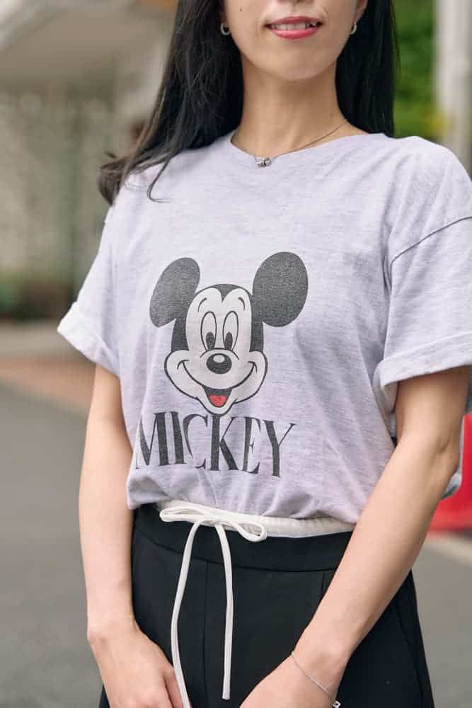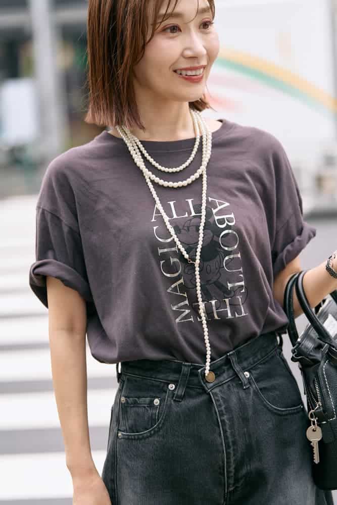 可愛さ満点のミッキーTシャツも、合わせ方を間違えるとディズニーマニア感が出てしまう危険性アリ。特に大人が取り入れる場合、サイズ感や襟ぐり、柄の主張具合、そして他アイテムとのバランスがカギになります。色を使わずトーンを抑えたり、インパクトのある小物を添えるなどコーデにひとさじの工夫を。センスよく着こなすSTORY読者のキャラT洒落見え術をご紹介します!