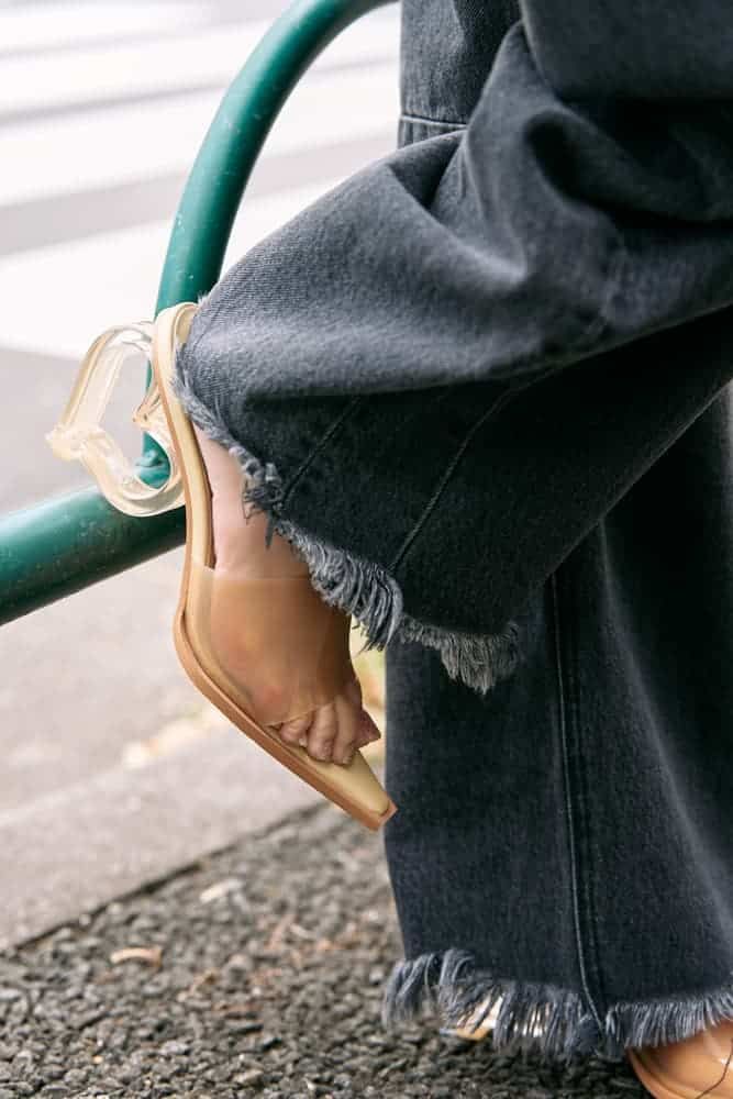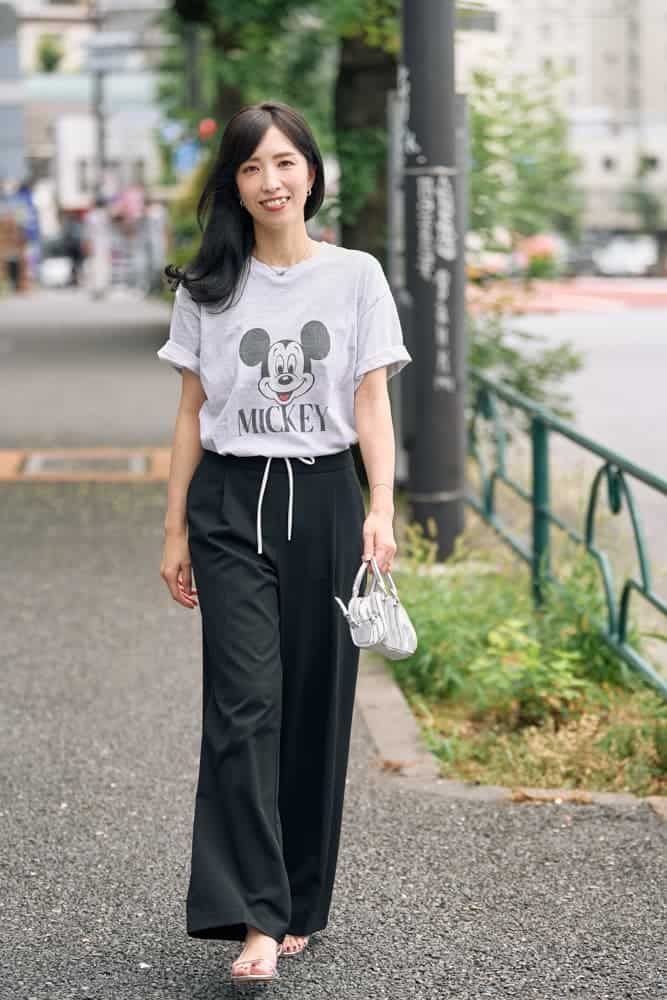 オーバーサイズのキャラクターTシャツは、子どもっぽく見えがちなアイテム。だからこそ、センタープレス入りのきれいめパンツや華奢なサンダル、シルバー小物で程よく大人っぽさをプラス。Tシャツが主役ですが、さりげなく品のあるスタイリングを心がけています。