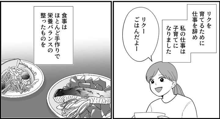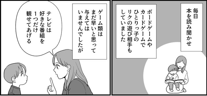 リクを育てるために私は仕事を辞め、私の仕事は「子育て」になりました。食事はほとんど手作りで、栄養バランスをしっかり考えています。毎日、本の読み聞かせをしてあげて、ひとりっ子のリクの遊び相手は私がしていました。テレビゲームの類はまだ早いと思って与えてはいません。テレビ漬けになるのも怖かったので、好きなアニメを1つだけ決めさせて、観せるようにしていました。