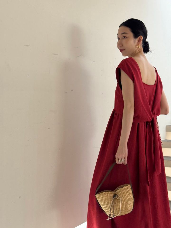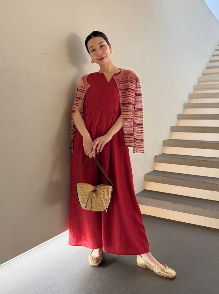 「赤いワンピースに同系色のシースルーカーディガンを肩掛けし、ニュアンスのあるワンカラーコーデに。小物にはナチュラルな風合いのシューズとバッグを。アクセサリーはゴールドのアイテムで都会的な印象に仕上げました。シンプルな装いながら素材や色のレイヤードにこだわり、夏らしくまとめた大人のワンピーススタイルです」