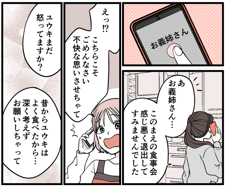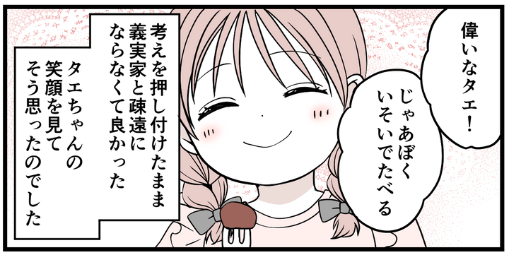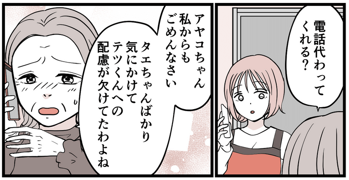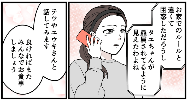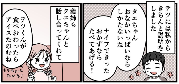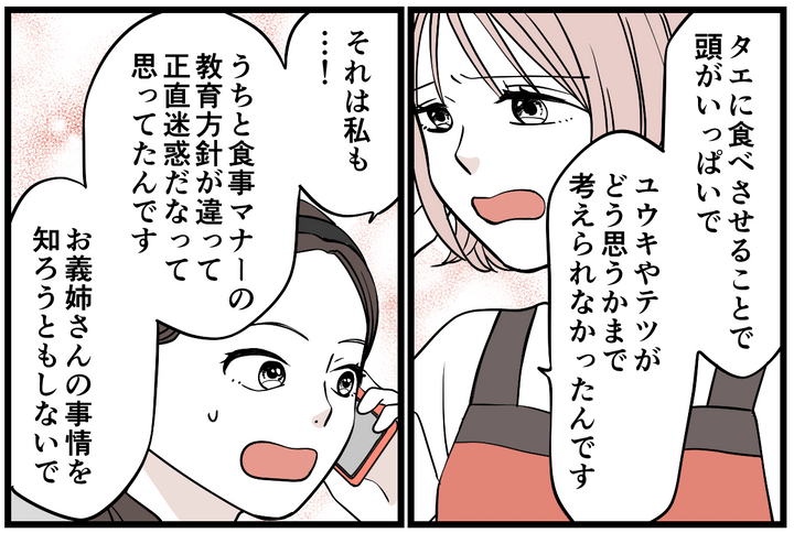「タエの食べ残しに関しては私も反省しているの。食べてほしいなら先に分けるべきだったよね。家族だからいいじゃんって甘えていた……ごめんなさい」「子育ては何が正しいとかないし、やみくもにやるしかなくて、やってみないとわかりませんよね」義姉と話していくなかで、「理解し合う」という気持ちが足りなかったことを痛感しました。