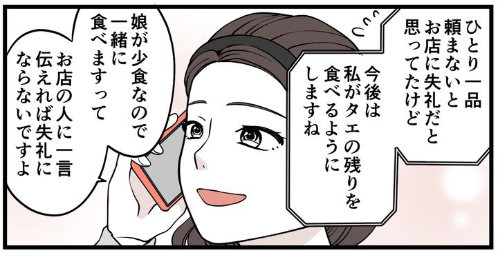 私はアヤコ。夫ユウキと幼稚園に通う息子テツの3人家族です。義姉ミサキさんの娘タエちゃんは外食で注文したものを食べ残すことが多く、義姉は残ったものを夫やテツに食べさせようとします。それだけでなく、残したのに好きなものやデザートを追加注文するのです。後日ママ友にそのことをグチると、義姉の気持ちがわかると言われます。ママ友の話を聞くと少食な子をもつ親の気持ちを私が理解できていなかったのだと実感しました。
