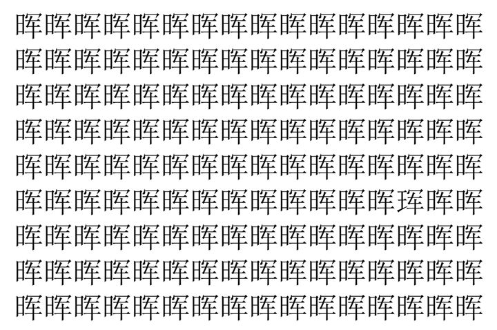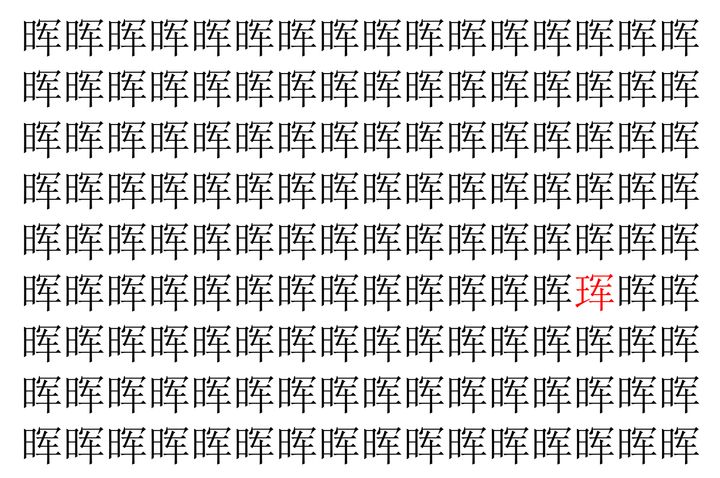 画像に並んだたくさんの「晖」という漢字。 その数144個なのですが・・・、実はその中に1つ違う漢字が紛れ込んでいます!!