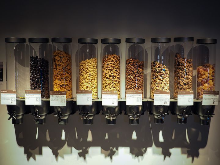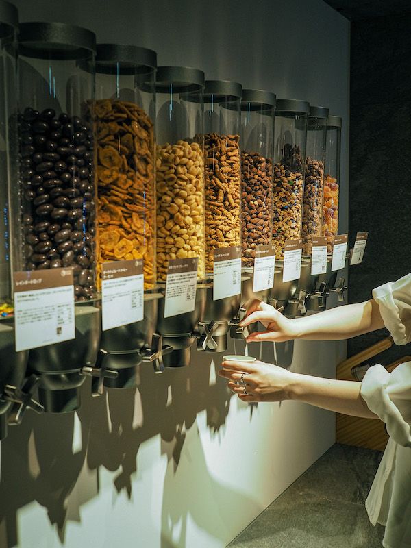 置いてあるフードディスペンサー機器と中のスナック類は、グローリートレーディングのもの。オーガニックやナチュラルにこだわった良質なナッツ、スナックが人気のお店で、ラウンジで用意されているグローリーのスナックは、売れ筋かつ他のスナックメーカーではあまり扱ってない珍しいフレーバーがセレクトされています。SNS映えするおしゃれなスナック&ディスペンサーは、見た目にも美味しさが伝わる素敵なディスプレイになっています。