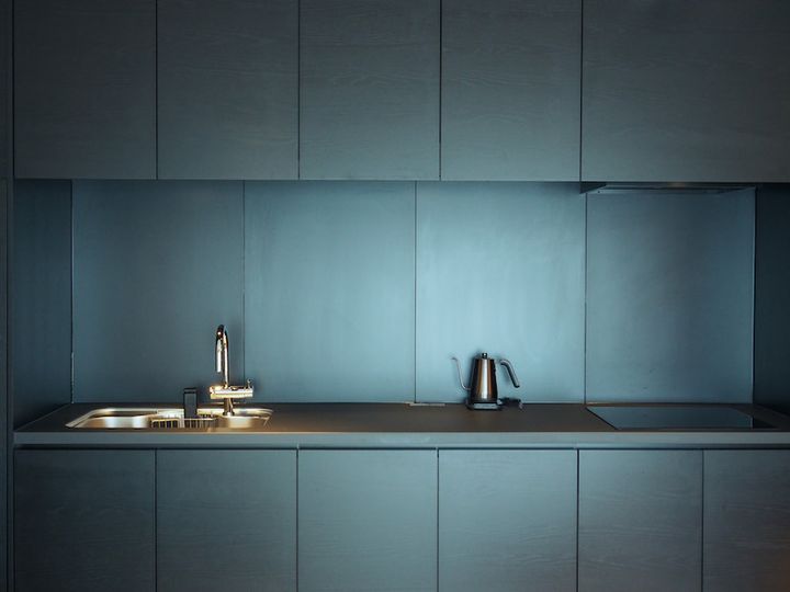キッチンスペースには、冷蔵庫や電子レンジ、トースター、ケトル、調理器具など、必要なものは全て揃っています。生活感を出さないよう、あえて冷蔵庫や電子レンジが戸棚の中に隠れているのもおしゃれ!シックなデザインのキッチンなら、料理をするのも気分が上がります。