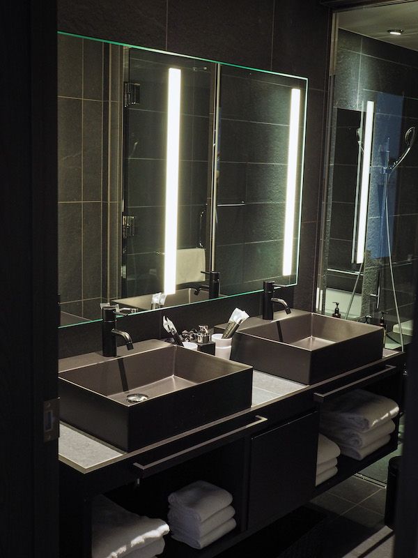 ちなみにバスルームも非日常感溢れるラグジュアリーな空間。黒を基調としたモダンでカッコいいデザインの浴室は、子供と大人で入っても余裕の広さ。ガラス張りのスケルトンのドアが解放感抜群です。洗面台は2台付いているので、人数の多い旅行でも順番待ちにならず使うことができます。もちろんアメニティも用意されているので、手ぶらで宿泊しても大丈夫!