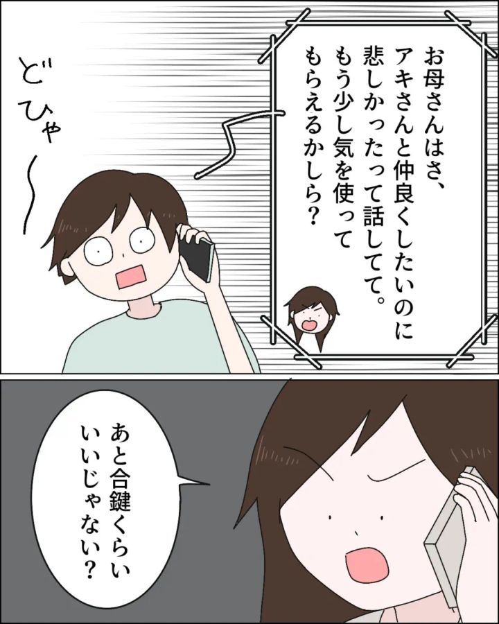 「お母さんはさ、アキさんと仲良くしたいのに悲しかったって話してて。もう少し気を遣ってもらえるかしら?あと、合鍵くらいいいじゃない?」