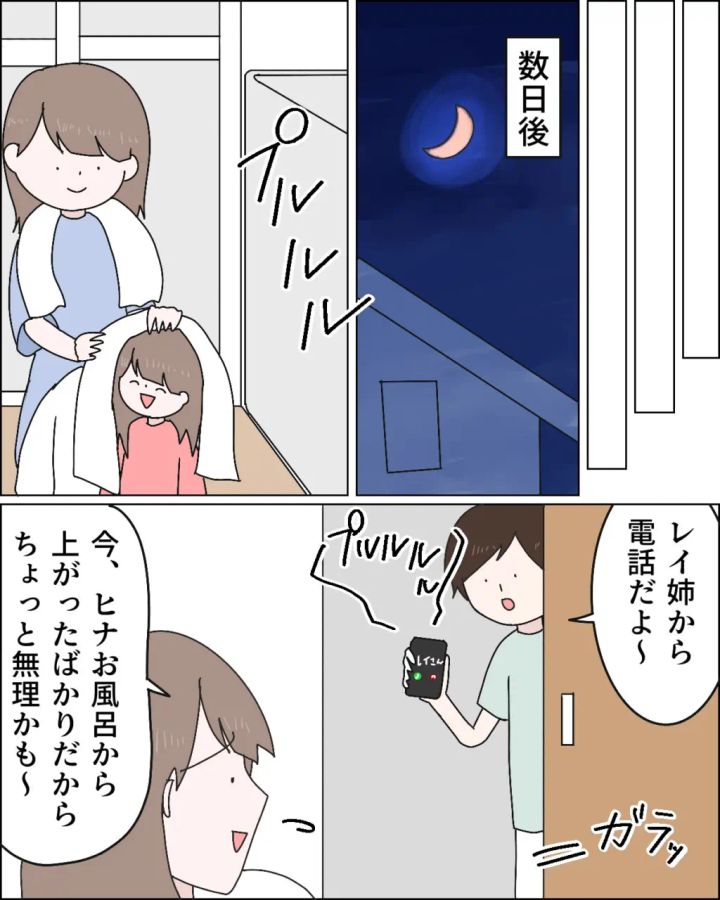 義母が合鍵で家に上がっていた日から数日経ったある日、ヒナをお風呂に入れていると義姉レイさんから私のスマホに電話がありました。ヒロムが気づいてスマホを持ってきてくれましたが、ヒナがお風呂から上がったばかりで手が離せなかった私。「ちょっと無理かも~」