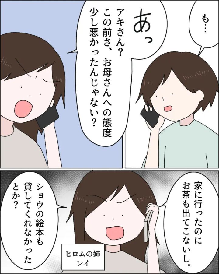 電話の相手は私だと思っているレイさんが早口でまくしたてました。「アキさん?この前さ、お母さんへの態度、少し悪かったんじゃない?家に言ったのにお茶も出てこないし。ショウの絵本も貸してくれなかったとか?」声の感じからレイさんはかなりご立腹のようです。