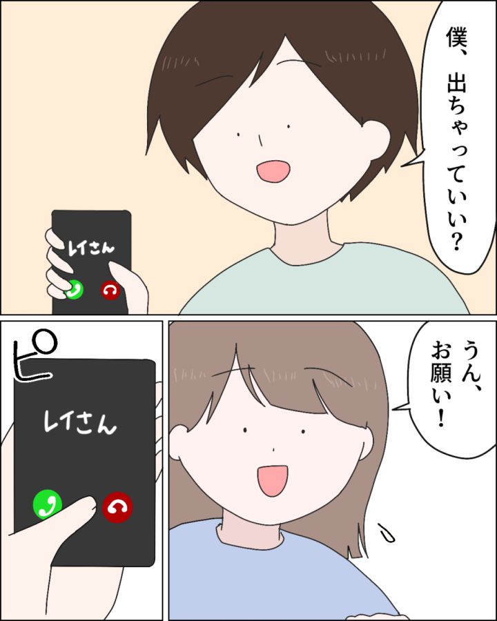 ひと通りレイさんがまくしたて、少し沈黙をおいたあと、ヒロムが「もしもし?僕だけど?」と冷めた感じでようやく話しました。それを聞いて「え!?」と慌てたレイさんです。