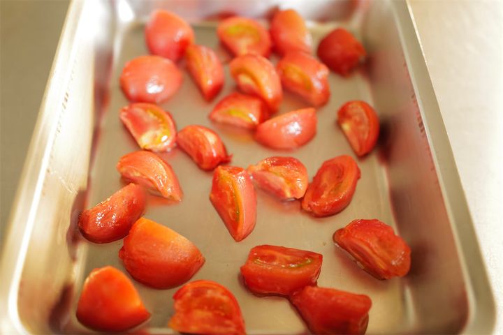 1. トマトを湯剥きし、一口大のくし切りにして冷凍する。