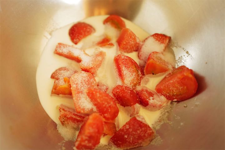 2. 冷凍したトマトを3~5分常温におき、ミキサーに入れて生クリームと砂糖を加えて攪拌する。