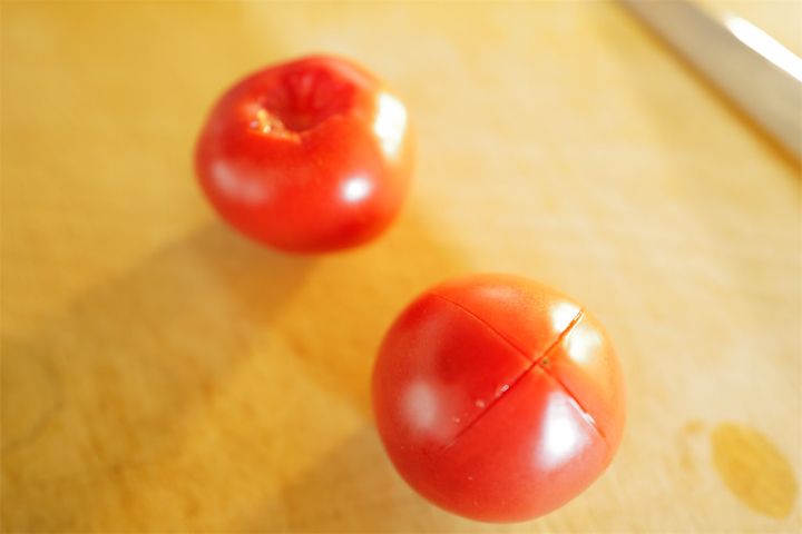 熱湯に浸ける前に、トマトの表面に浅く十字に切り込みを入れるときれいに剥けます。