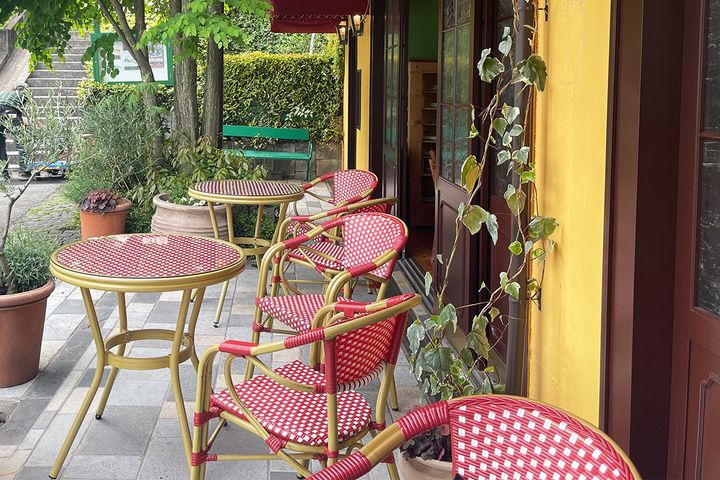 人気のテラス席は、レッドの丸テーブルとチェアが、まるでヨーロッパの街角のよう。テラス席はペットOKなので、 愛犬と一緒にゆったり過ごすこともできます。