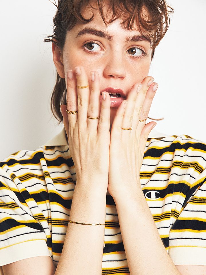 ボーダーTシャツ/チャンピオン × レイ ビームス(レイ ビームス 新宿) リング(左手・薬指)、 リング(右手・薬指)、リング(左手・人さし指)、リング(右手・人さし指)、リング(右手・中指)/以上ココシュニック オンキッチュ(ココシュニック) ブレスレット/エネイ(ショールームリンクス)