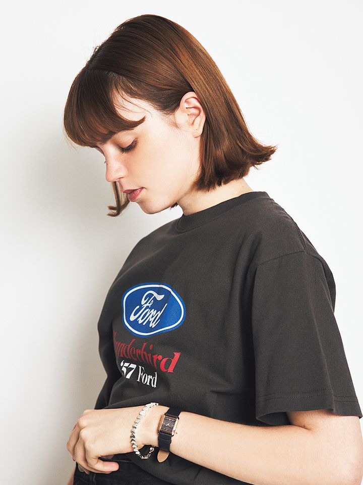 目を引くデザイン性を帯びたTシャツには、あえて手元をアクセサリーで盛ることで、視線を分散。結果Tシャツ自体の主張が和らぐから、むしろ親しみやすくなるメリットが。