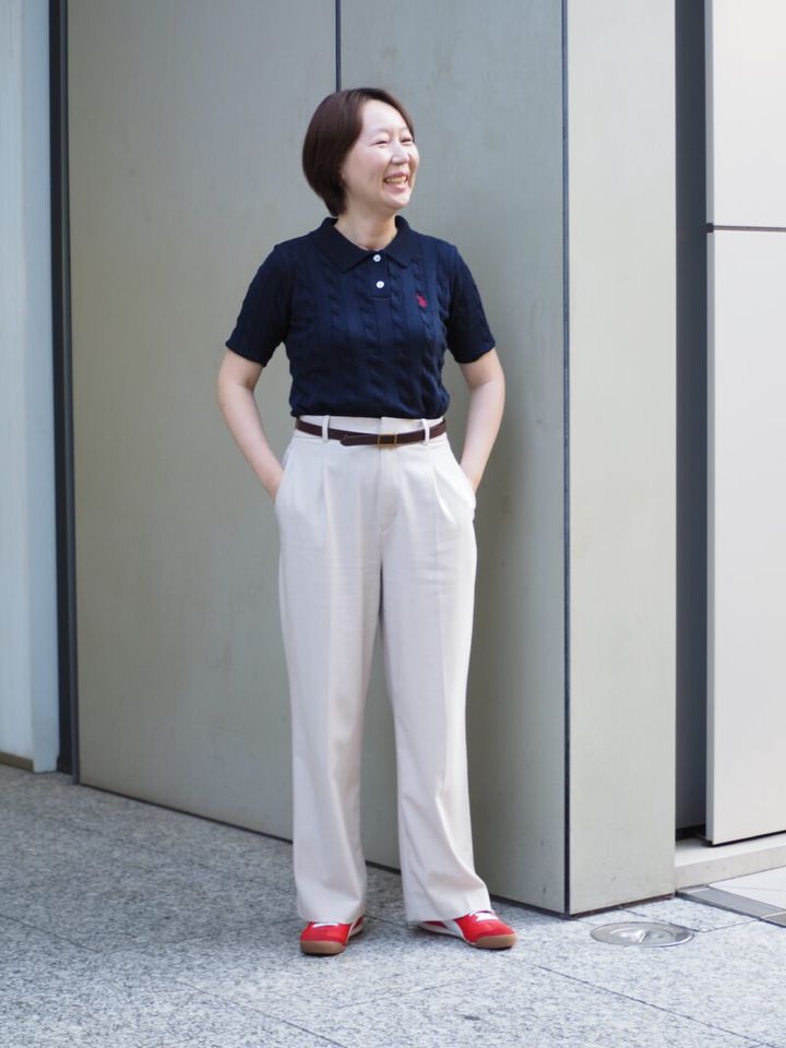 「ポロ ラルフ ローレン」のポロシャツに合わせたのは、「ユニクロ」のタックパンツ。センタープレス入りで、脚長効果が抜群の一本です。軽やかなオフホワイトがネイビーのトップスを引き立て、夏らしい清涼感を演出。「Tシャツやパンツでファストファッションを取り入れつつ、ジャケットはこだわってみたり」。メリハリをつけてファッションを楽しんでいる様子。
