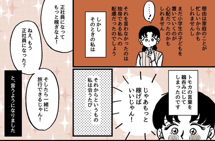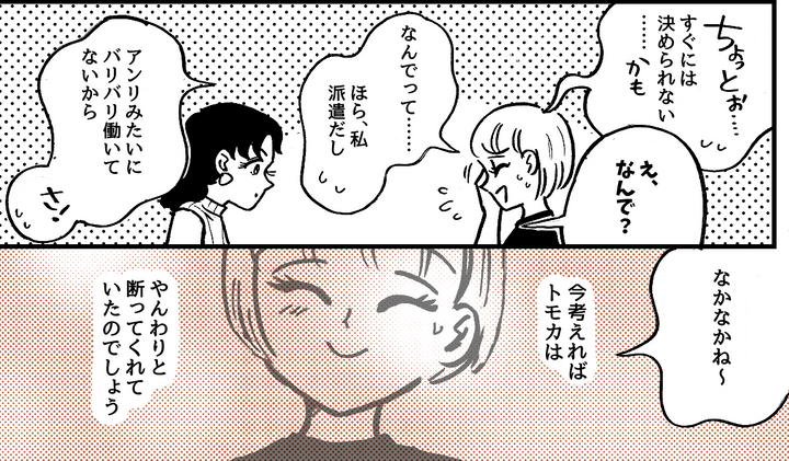 「どうかな~。ちょっとすぐには決められないかも……ほら、私派遣だし、アンリみたいにバリバリ働いてないからさ」と、派遣社員であることを理由に旅行の誘いを断られてしまいました。そのときの私は、トモカの言葉を鵜呑みにして「じゃあもっと稼げばいいじゃん」と思ってしまったのです。トモカが私に気を遣った言い方をしてくれていたと気づかずに。
