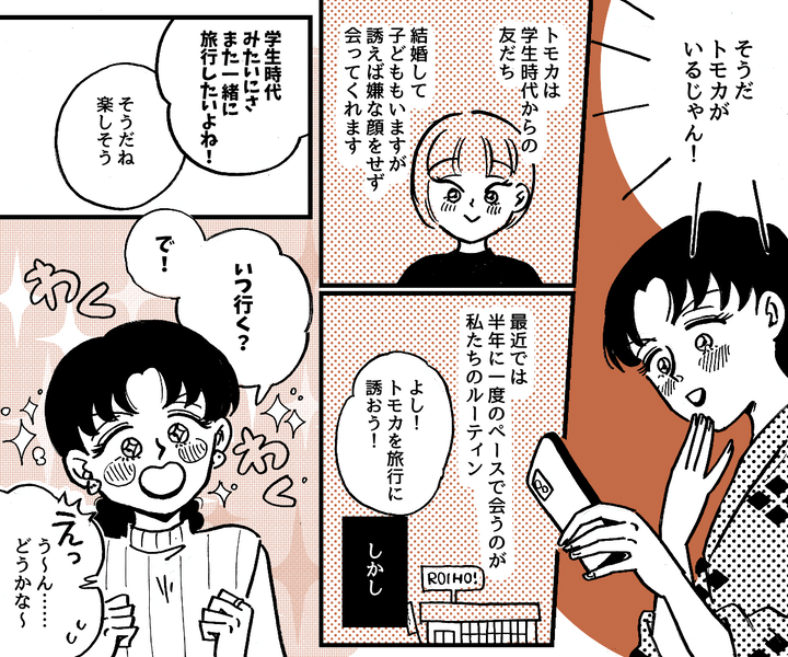 私はアンリです。今年40歳になったばかりの私は、実家で両親と暮らしながら、正社員としてバリバリ働いています。私自身は独身ですが、まわりの友だちは既婚者ばかり。結婚して地元から出ていってしまったり、育児で忙しかったりと、なかなか会うことができません。唯一お互い時間を合わせて会えるのは、学生時代からの友だちのトモカくらいです。トモカは子持ちの既婚者ですが、なんだかんだと会ってくれるので嬉しく感じています。できれば学生時代のように、また2人で旅行もしたいです。
