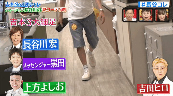 ナビゲーターの“DJハマー”ことテンダラーの浜本広晃は、⻑⾕兄の夏ファッションにハイテンション。1つ1つのアイテム以上に、⻑⾕兄の足に目を奪われたらしい。「短パンから伸びる足が細い! そう……吉本3大細足、⻑⾕川宏、メッセンジャー・黒田(有)、上方よしお! 虎視眈々と吉田ヒロも後を追う!」「全女子の憧れ……いや、菜々緒の憧れ……かも!」と、ファッション以上に力を込めてナビゲートした。