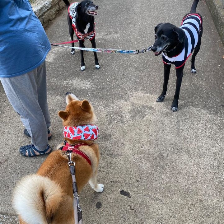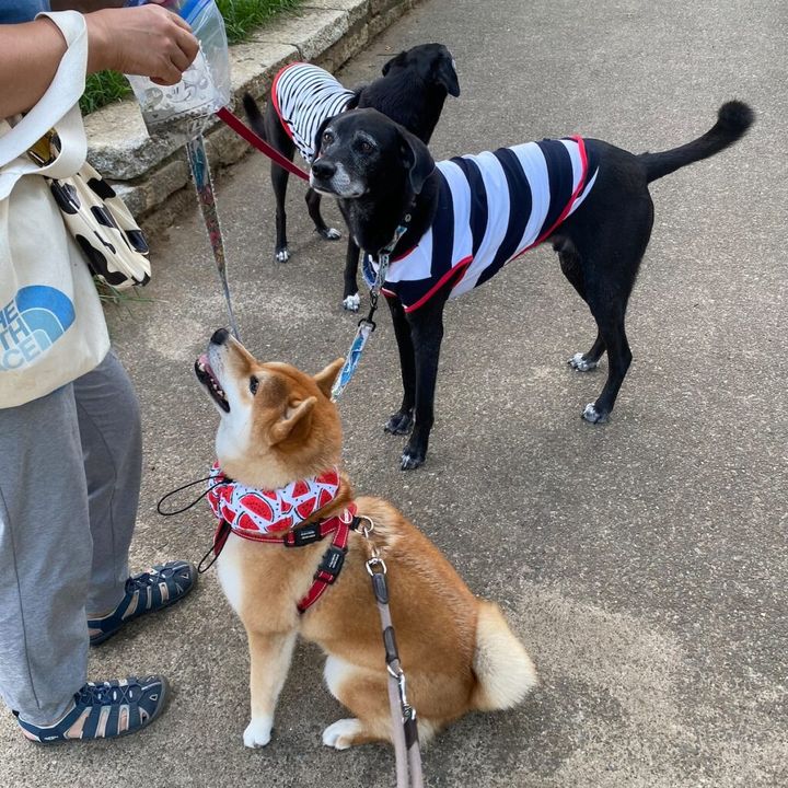 こんにちは、ハルくんです。お散歩の途中でストライキを起こすぼくたちのことを「拒否柴」と呼ぶってことは、前にもご説明したかと思います。この現象が起こる理由としては、怠慢、疲労、待機、期待などいろいろありますが、だいたいがミックスされていることが多いです。この日もそう。ちょっと暑くてへばっていたところに、遠くに台湾犬のグーフィーとオレオの兄弟が見えたので、近づくまで休憩、こっちに来たら一緒に遊んで、それからグーフィーママがいつも持っているおやつをもらう、という完璧な展開を想定していました。果たしてどうなりましたやら……。