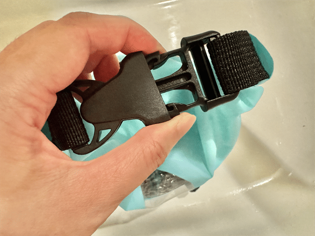 ウォッシュバッグの口を3回ほど折り返し、バックルを留めます。