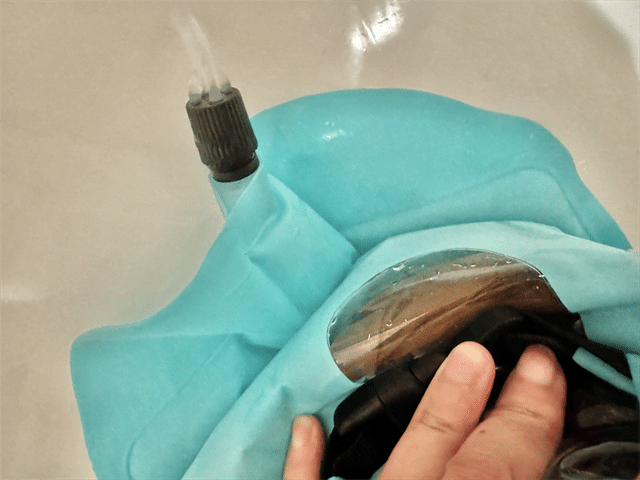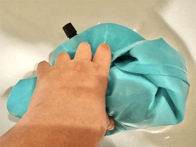 何度か振ったら、バルブをゆるめて排水します。今回は洗剤を使っているので、排水後再び水を入れ、泡立ちがなくなるまですすぎを繰り返しました。10Lサイズなどもあるウォッシュバッグですが、こちらは3Lと小さめサイズのため、洗面台で一連の作業がスムーズに完結できます。