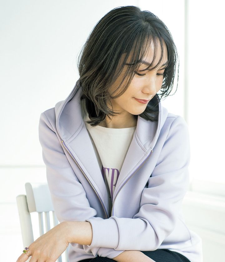 パーカ¥11,500、リング〈アメジスト〉¥25,900、リング〈シトリン〉¥25,900(すべてアテニア)Tシャツ¥13,200(マイカ アンド ディール/マイカ アンド ディール 恵比寿本店)ピアス¥2,200(アネモネ/サンポークリエイト)