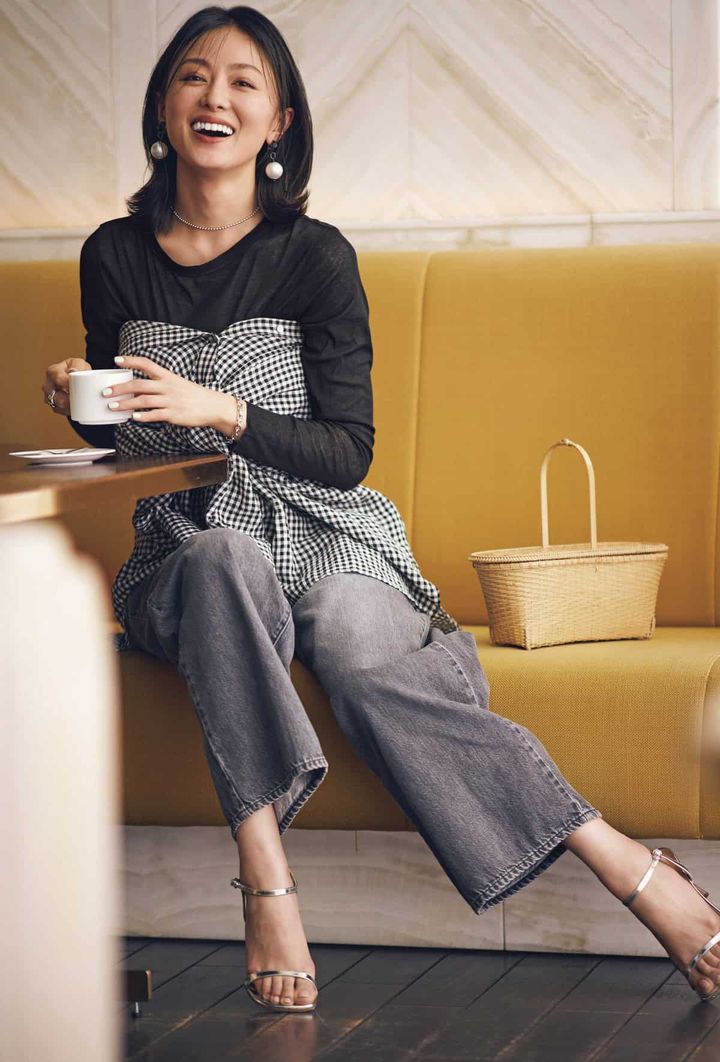 黒トップスとデニムには、ギンガムチェック柄のシャツをビスチェ巻きで投入。ただ羽織ったり肩掛けしたりするよりも、華やぎもお洒落の完成度もぐんとアップ。甘さとカジュアル感の絶妙なバランスは、ギンガムならでは。キレイめ派にも、マニッシュ派にもおすすめです。