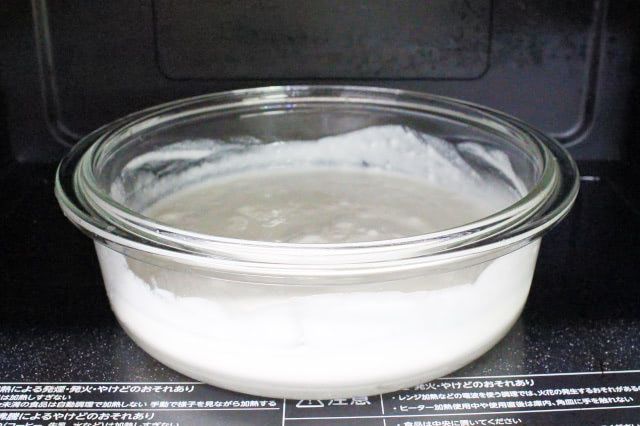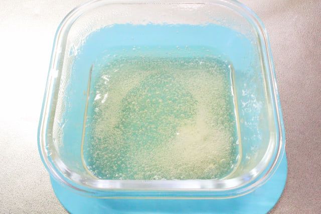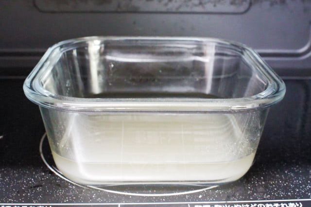 寒天液はフツフツとするまで加熱するので、溢れないように、少し大きめの器を使うのがおすすめです。レシピ通りに電子レンジ(600W)で1分20秒の加熱だと溶け残りがあったので、今回は1分追加して、トータル2分20秒加熱しました。