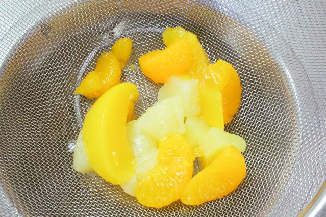 1. 缶詰のフルーツを使う場合は、ザルに上げてシロップを切ります。