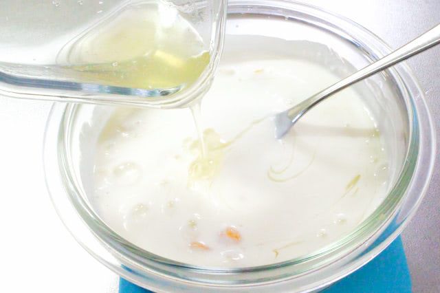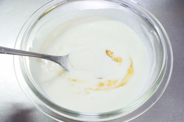 2. 耐熱性の器にヨーグルトを入れて、なめらかになるように混ぜます。電子レンジ(600W)で、1分30秒加熱します。