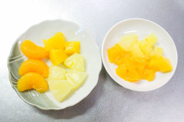 型を用意しなくていいので、気楽に作れます♪今回は、缶詰のミックスフルーツを用意して作ってみます。