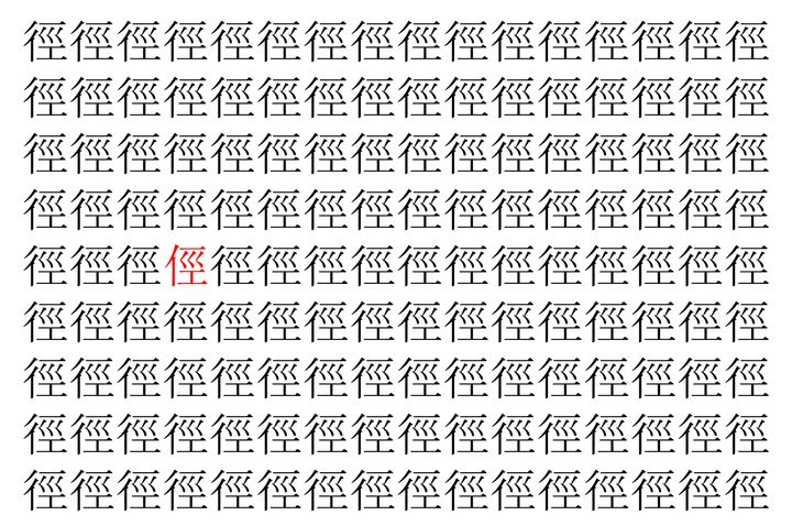画像に並んだたくさんの「徑」という漢字。 その数144個なのですが・・・、実はその中に1つ違う漢字が紛れ込んでいます!!