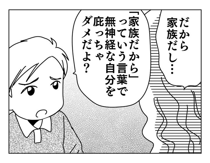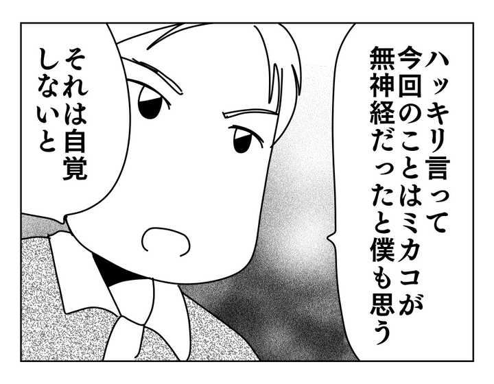 ここまで揉めたのに、まだ「何が悪かったの?」「家族だから」と言ってしまうなんて、ミカコさんは本当に悪気なく自然に無神経なことを言っていたのですね。やれやれ……。コウヘイさんにもっとビシッと強めに叱ってもらいたいところですが、そうするとへそを曲げて家庭がうまく回らない可能性もあります。ミカコさんに伝わりやすくするために言葉を選んで話すあたり、ミカコさんの家庭もコウヘイさんの気遣いがあってうまく回っているのかもしれません。今度こそ、ミカコさんがしっかり反省してくれることを願います!