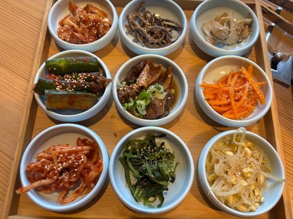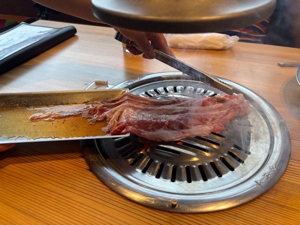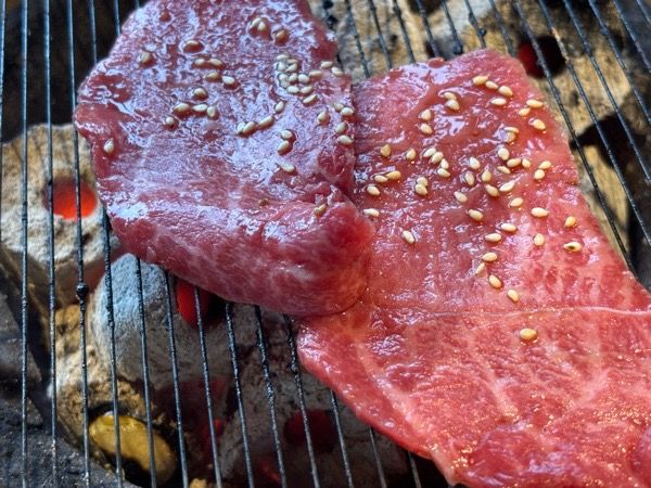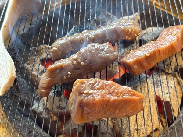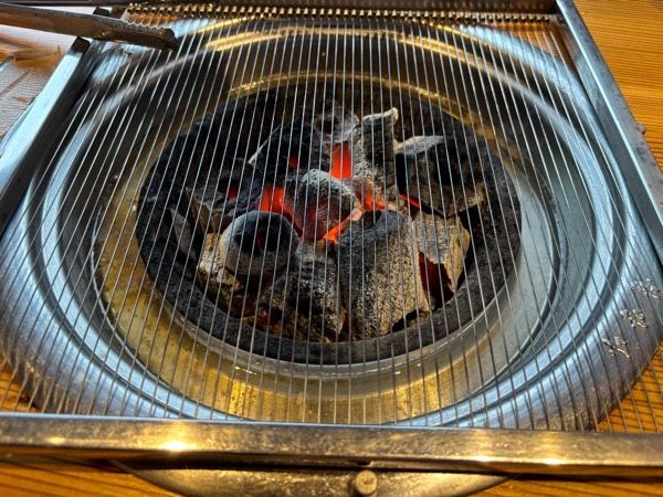 白菜、きゅうり、大根のキムチにもやし、エリンギ、人参、ゼンマイ、ほうれん草のナルム。キムチももちろん手作り無添加。お酒のあてにもいいですね。 さあ、鉄板から網に変えていただきお肉を焼いていきます。鉄板と網にもこだわりがありどちらも韓国から直輸入。ピアノ線ほどの細さの網でお肉がおいしく焼け、なおかつ焦げにくい特徴があります。