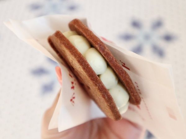 クッキー2枚の中には白い恋人のホワイトチョコレートを使用したバタークリーム、北海道産小豆の粒あん入り。