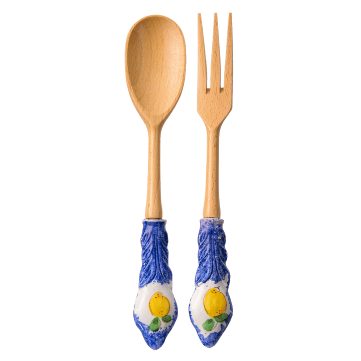 イタリアで制作された木製のカトラリー。長さ26.5cmと大きいサイズのため、大皿料理のとりわけに最適。陶器でできた持ち手部分には、青をベースにレモンの絵柄がやさしく描かれていて、どこか懐かしさを感じさせる意匠に。器に添えるだけでも、テーブルに爽やかな彩りを与えてくれる。