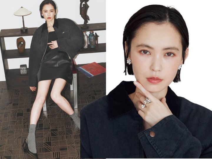 「フリヴォル」イヤリング[WG×DIA]¥2,996,400、「フリヴォル」リング[WG×DIA]¥1,914,000(共にヴァン クリーフ&アーペル/ヴァン クリーフ&アーペル ル デスク)、ブルゾン¥97,900、スカート¥49,500(共にアンスクリア/アマン)、ビスチェ¥28,600(ルームエイト ブラック/オットデザイン)、靴下¥3,630(パンセレラ/真下商事)、シューズ¥140,800(ロド/メゾン・ディセット)