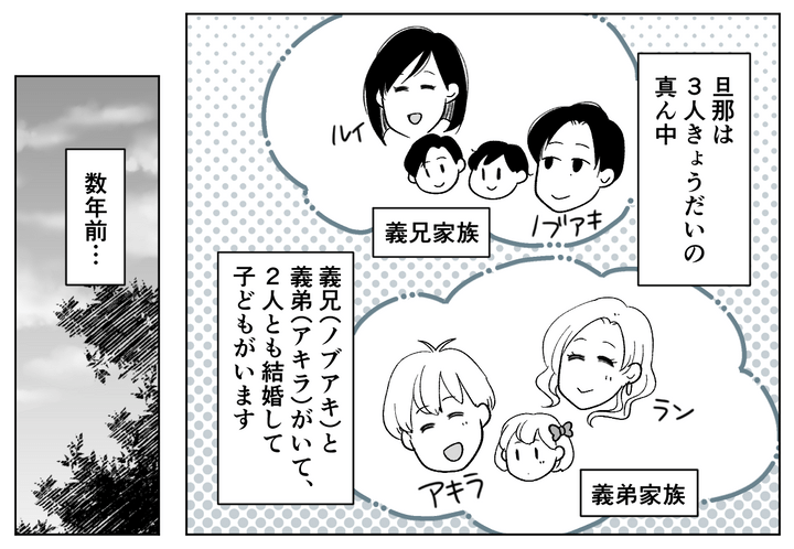 旦那は3人きょうだいの真ん中です。義兄(ノブアキ)と義弟(アキラ)は2人とも結婚して子どもがいます。義兄は結婚をするときに奥さんの婿になり、奥さんの会社に入り、奥さんの実家の近くに住むことになったため、家を出ていきました。