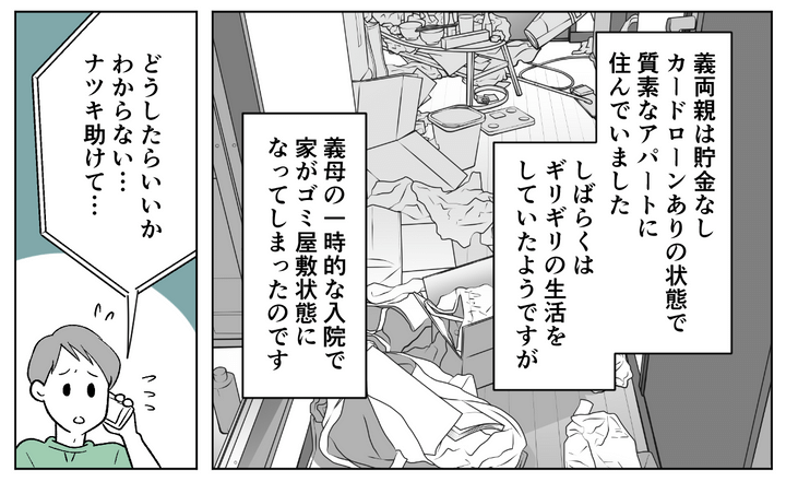 貯金なし、カードローンありの状態で質素なアパートに住んでいた義両親。義母の一時的な入院で、家がゴミ屋敷状態になってしまったそうです。今までは義母が掃除をしていましたが、義父は一切掃除をしないんだとか。そして義母の退院後、旦那に助けを求める電話が……。